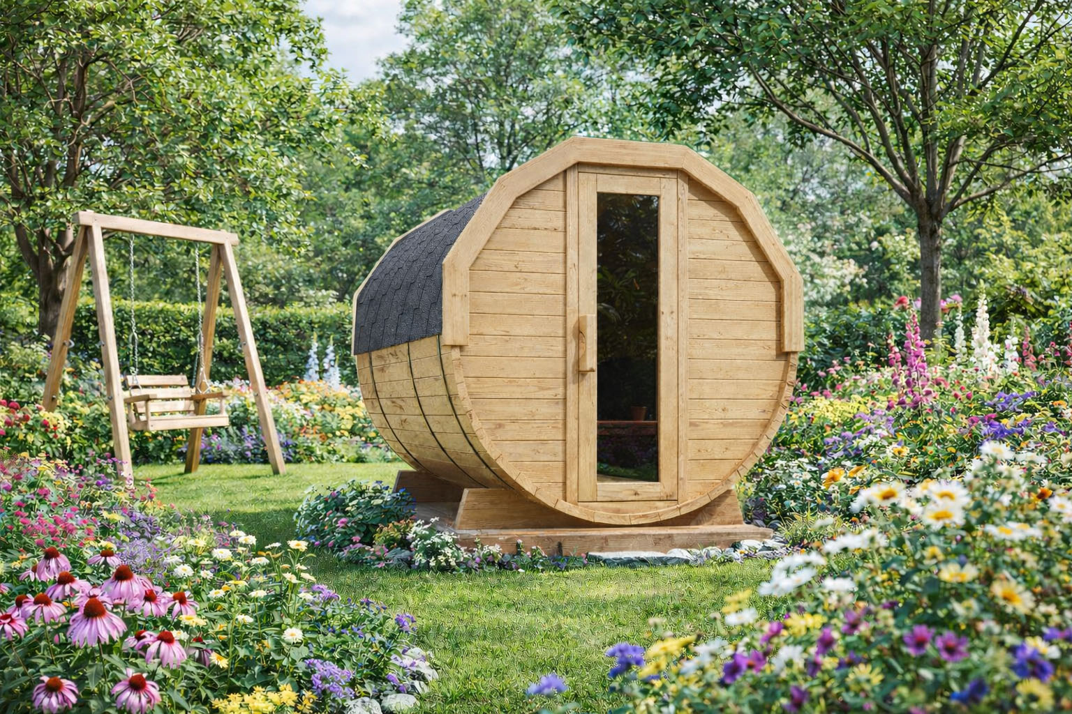 Odkryj luksus codziennego wyciszenia we własnym ogrodzie. Sauna ogrodowa typu beczka to połączenie ponadczasowej formy, naturalnych materiałów i dopracowanych detali, które tworzą klimat prawdziwego SPA — bez wychodzenia z domu. Eleganckie, przeszklone drzwi subtelnie doświetlają wnętrze, a solidna konstrukcja z grubej deski zapewnia przyjemne, stabilne warunki do seansu.